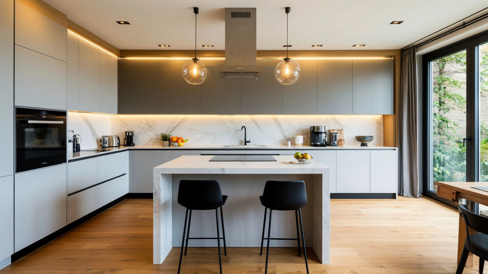 Каждая деталь кухни продумана для максимального комфорта. Ручки, петли, механизмы плавного закрывания и выдвижные системы обеспечивают удобство в повседневном использовании. Наличие острова создаёт дополнительные рабочие и обеденные зоны, делая кухню многофункциональной. Пространство организовано так, чтобы каждая вещь имела своё место, облегчая приготовление блюд и поддержание порядка.