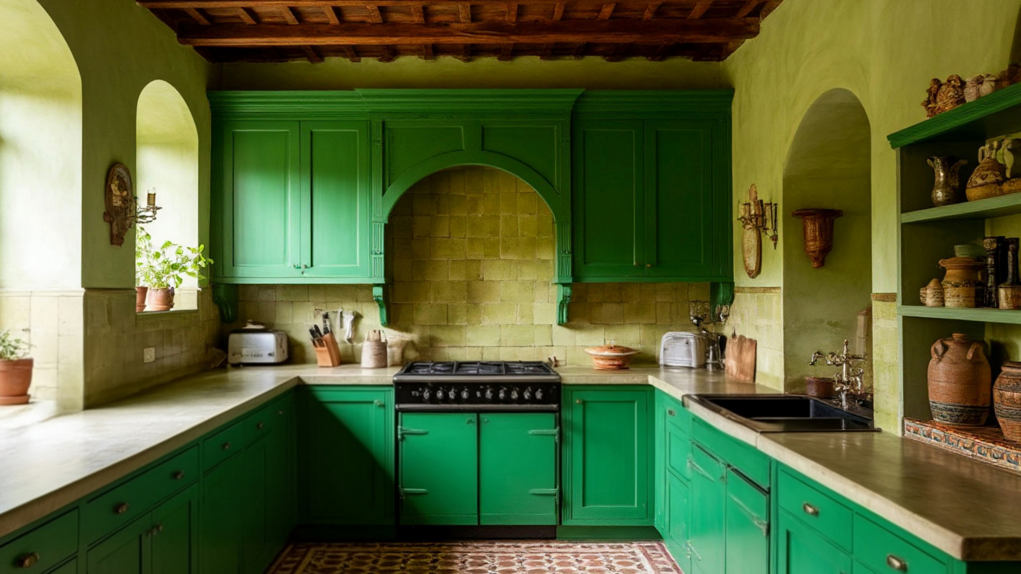 Материалы для кухни выбраны с учётом долговечности и эстетики. Поверхности фасадов имеют матовую текстуру, приятную на ощупь и устойчивую к внешним воздействиям. Столешницы выполнены под натуральный камень, что идеально соответствует римской концепции, где ценятся прочность и натуральность. Такой выбор не только эстетически красив, но и практичен: поверхность устойчива к влаге, температурным перепадам и механическим повреждениям. Сочетание зелёных фасадов и каменной столешницы создаёт гармоничный дуэт природы и архитектурного величия, подчёркивая идею единства красоты и практичности.