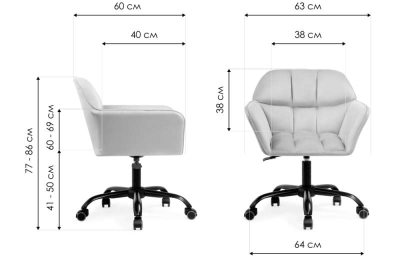 Высота подлокотников: 60 - 69 см Диаметр крестовины: 64 см